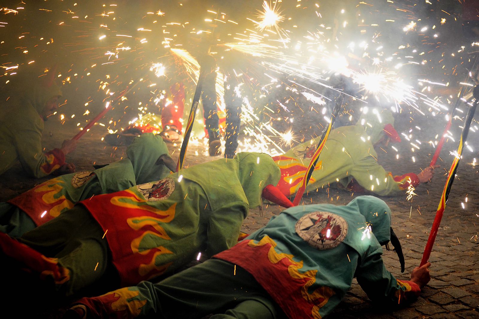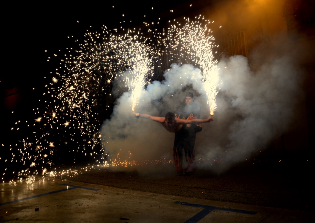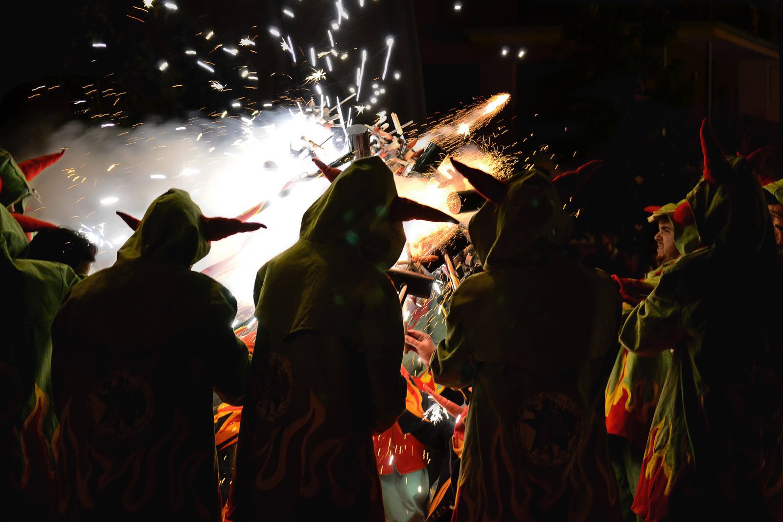 Bajo las órdenes del Diablo Mayor (Lucifer) y de la Diablesa, los diablos lucen la fuerza del infierno, corriendo, bailando y saltando, en correfocs y en otros espectáculos. La Muerte otro de los personajes que hace acto de presencia en las actuaciones y, con su guadaña, se abre camino entre los diablos. Recorriendo las calles de pueblos y ciudades, estos seres mitológicos danzan con los ceptrots y las horcas, bajo el gran protagonista, el fuego.
